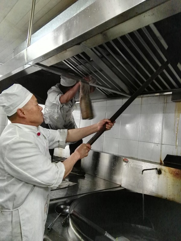 一是坚持每周星期五下午对餐厅进行大扫除,洗拆抽油烟机、餐厅玻璃,清洗地面、水槽等,后勤员工有序工作一丝不苟。