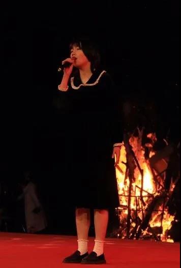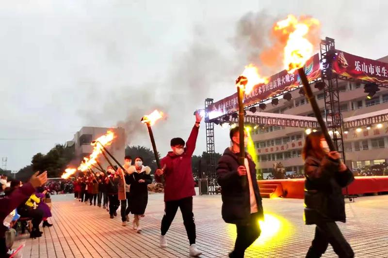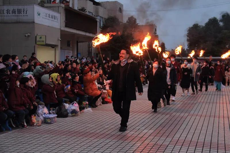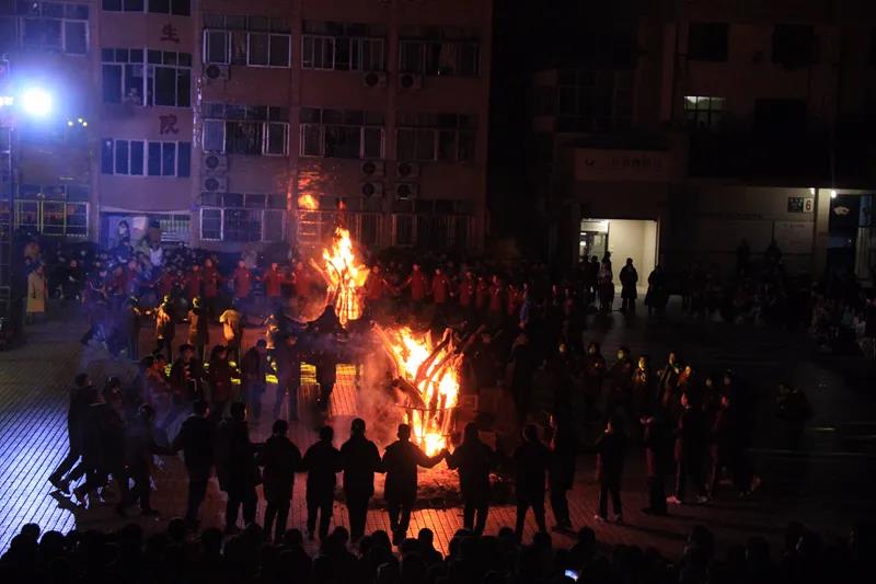 在训导处主任余勇宣布篝火晚会开始后,由阮平校长带队,18位来自不同部门、不同年级的师生点火代表手持火把,在全场的欢呼声中绕场一圈后点燃了四堆篝火。
